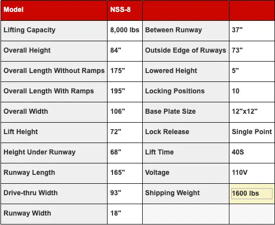 Operating on a standard 110 volts, the NSS-8 X1 is designed for ease of installation and compatibility with most garage or shop electrical systems. Its shipping weight of 1,600 lbs underscores the lift's robust construction and stability, promising years of reliable service. Additionally, the inclusion of a 12" x 12" base plate size further ensures a secure and stable foundation for lifting operations.