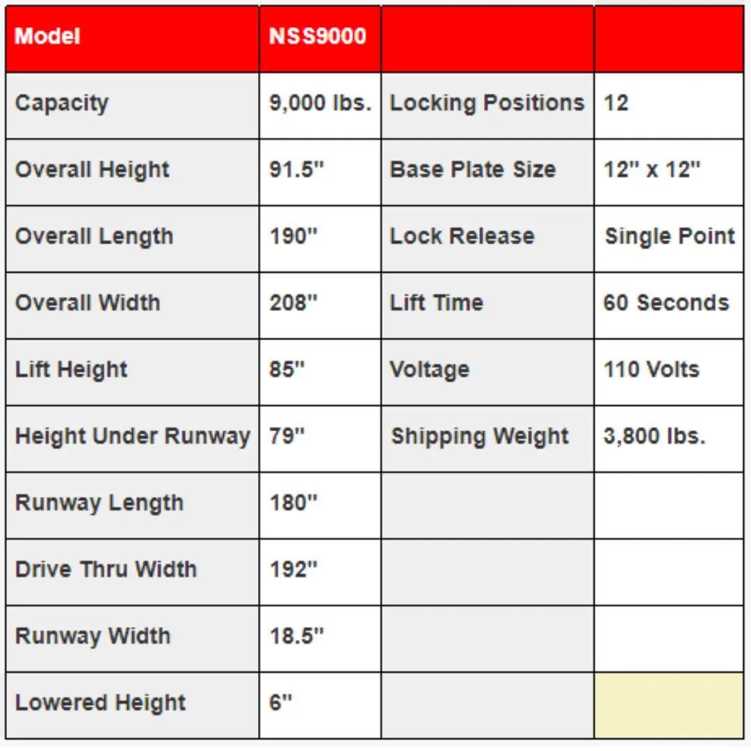 With generous dimensions—such as a lifting height of around 77", 72" clearance under the runway, and a spacious 192" drive-through width—this model accommodates a wide variety of cars and light trucks while delivering smooth, dependable hydraulic performance and uncomplicated single-point lock release operation. Whether you're optimizing garage storage or working on multiple vehicles, the NSS-9 delivers strength, safety, and versatility.
