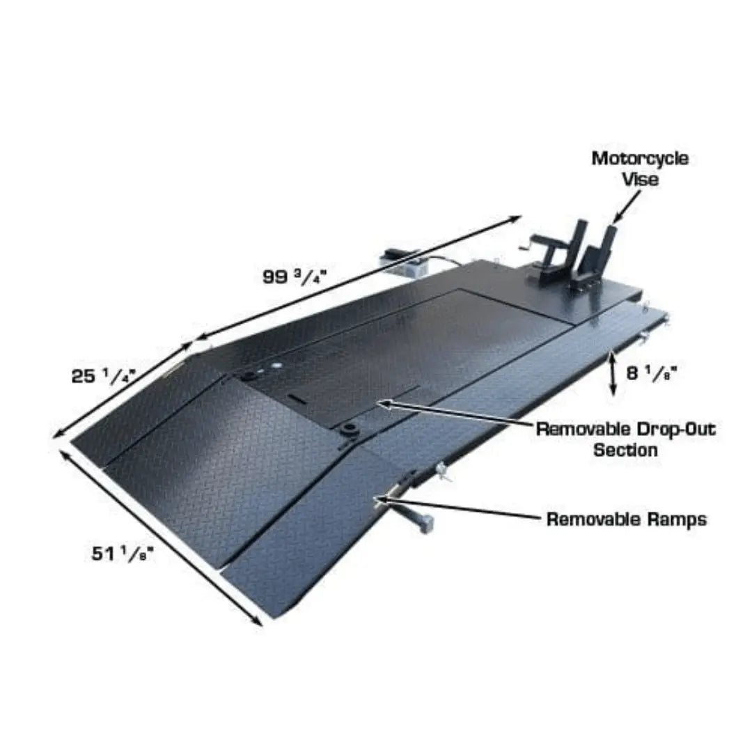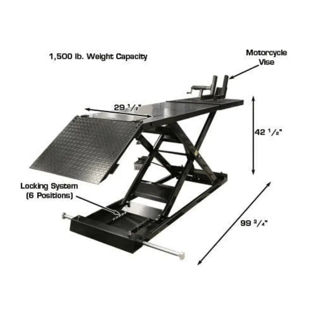 The Atlas® HI-RISE 1500 has an extra tall lift height of 43 inches. This increased lifting height makes it easier to work on vechicles while the operator is standing. This lift comes standard with a chopper extension making the center table 100 3/4 inches long and able to accept some of the longest choppers. The lift also comes standard with a side extension kit, with an overall table width of 51 1/8 inches, and is able to easily lift ATV's, UTV's, Golf Carts, Lawnmowers and other four wheel vehicles. The HI-RISE 1500 is the perfect addition to any service department of professional motorcycle dealers or equipment service shop or even a homeowner who wants to work on bikes or ATV's in their own garage.