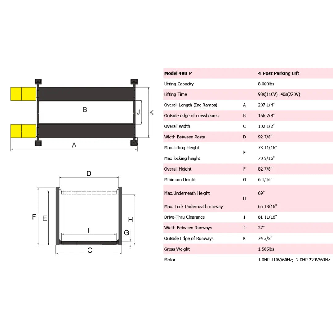 Equipped with either a 1.0HP motor for 110V/60Hz operation or a 2.0HP motor for 220V/60Hz, the 408-P is adaptable to different power supplies, ensuring seamless integration into any workshop or garage setting. Its gross weight of 1,649lbs underscores the lift’s solid construction and durability, promising long-term reliability and performance.