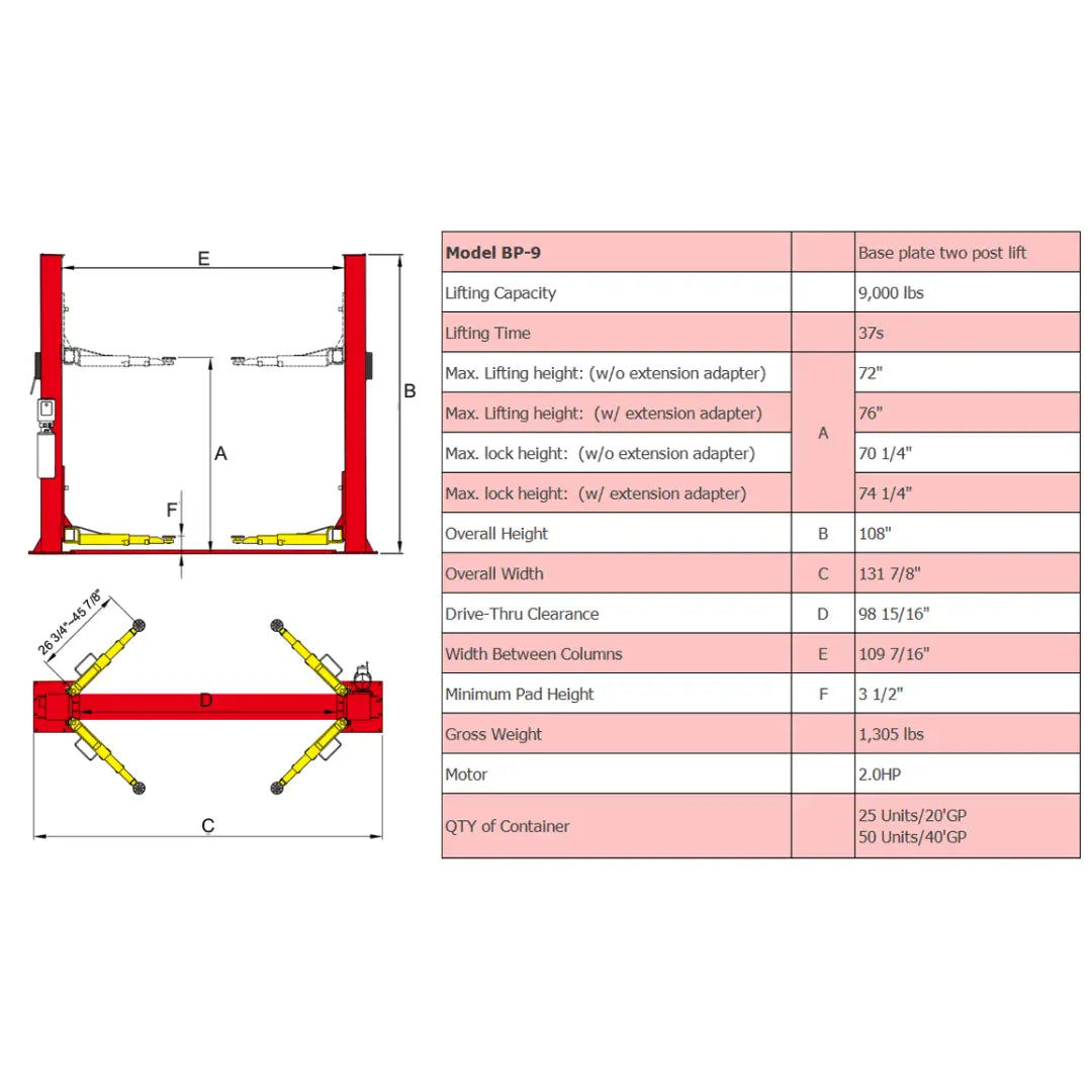 AMGO BP-9 is equipped with a dual safety lock structure and a single-point manual lock release mechanism, ensuring both safe and comfortable operation. The base plate design provides shorter columns to accommodate ceiling height 9ft or higher. Its symmetric 3-stage retractable arms offer large swing ranges to accommodate varying vehicles weighing up to 9000lbs.