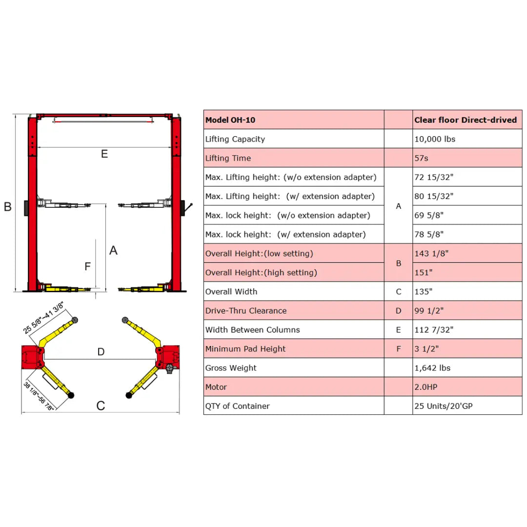 With a lifting capacity of 10,000 lbs and adjustable lifting heights ranging from 71 1/2″ to 80 1/2″, the AMGO OH-10 is versatile enough to handle a wide array of vehicles. It's also backed by extensive warranties, including five years on steel components, three years on hydraulic parts, and two years on electrical components, underscoring AMGO's commitment to quality and customer satisfaction. CE approved and meeting or exceeding the standards prescribed by European Standard EN-1493, this lift is a safe and reliable choice for any automotive workshop.