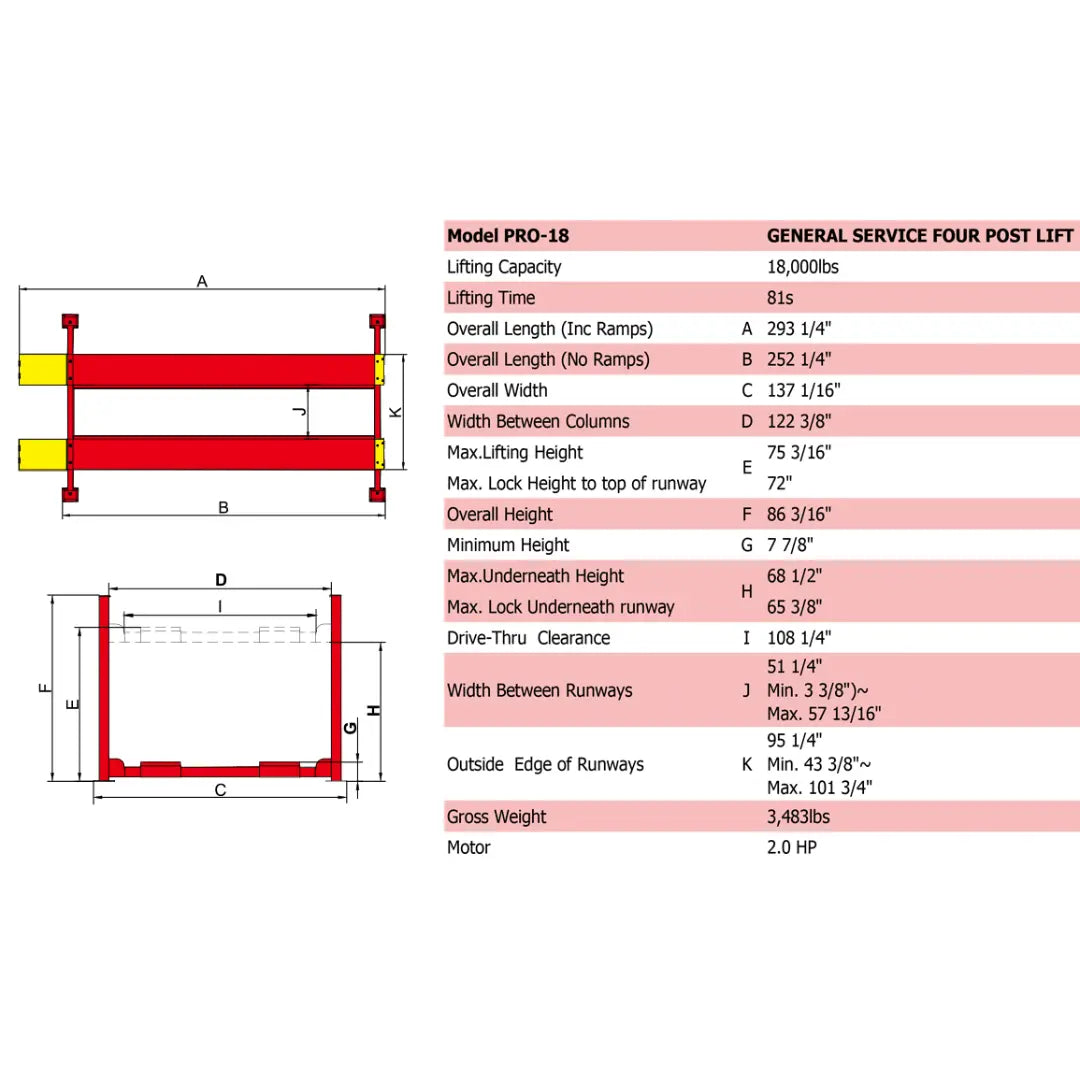With a lifting capacity of 18,000 lbs, the Pro-18 is designed for maximum stability. Its extra-wide, diamond-plated runways provide superior traction, while the adjustable width ensures compatibility with a variety of vehicles. This 4 post car lift also offers a generous drive-thru clearance, making it easy to load and unload oversized vehicles quickly.