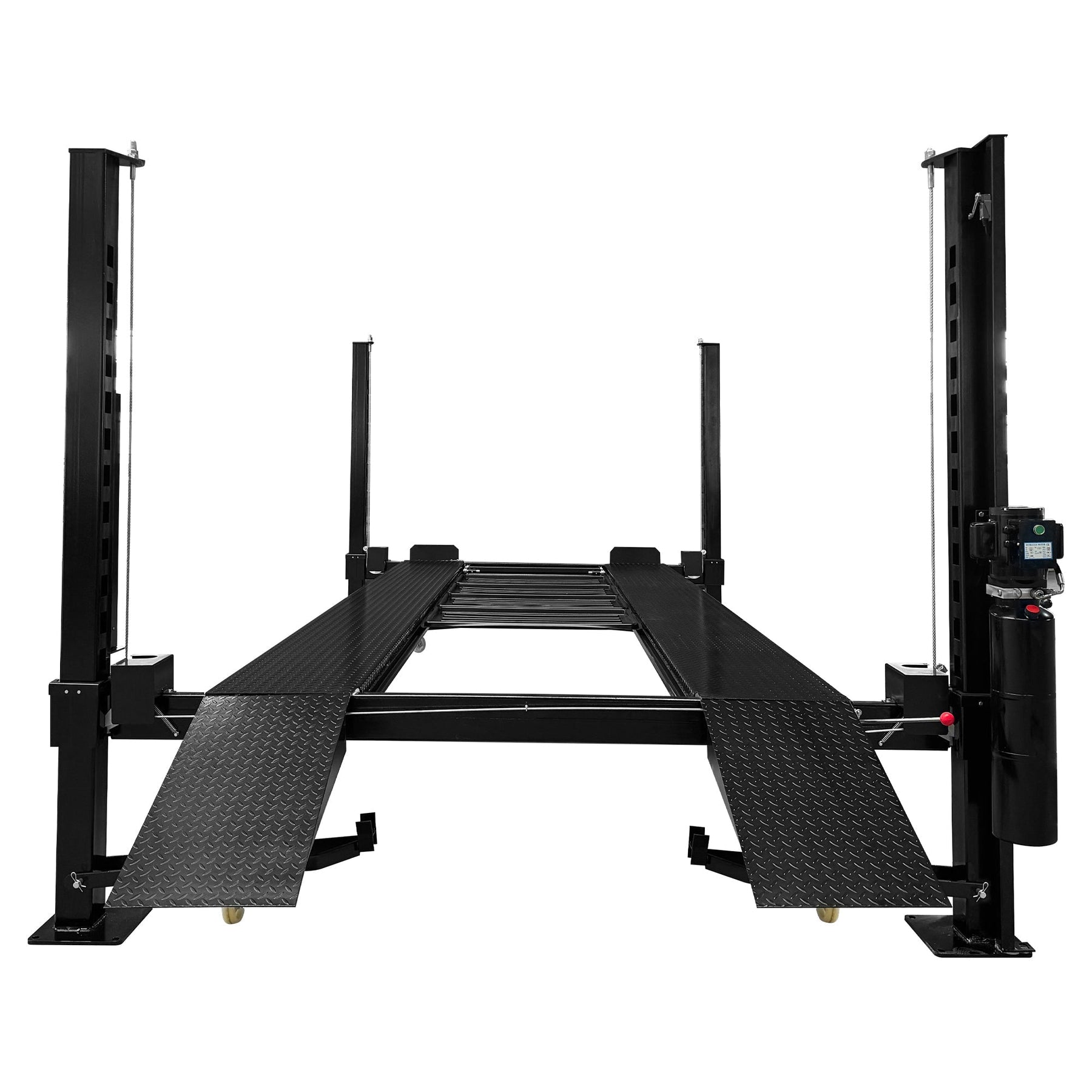 APlusLift HW-4P11S 4-post car auto lift truck hoist package includes a caster kit with polyurethane wheels, a jack tray, and two removable approach ramps. The caster kit allows customers to move the lift around the garage easily and can be installed or removed in minutes. The jack tray allows customers to use a jack to lift one end of the vehicle. The drip trays(Optional) prevent fluid from the top vehicle from dripping onto the bottom vehicle. Optional sliding jacks and drip trays are available for purchase.