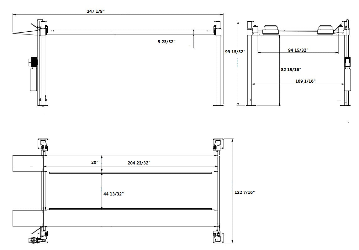 • Drive Through Width 112"; Lifting Height: 88 21/32"; Overall Dimensions 247 1/8"L x 122 7/16"W x 99 15/32"H