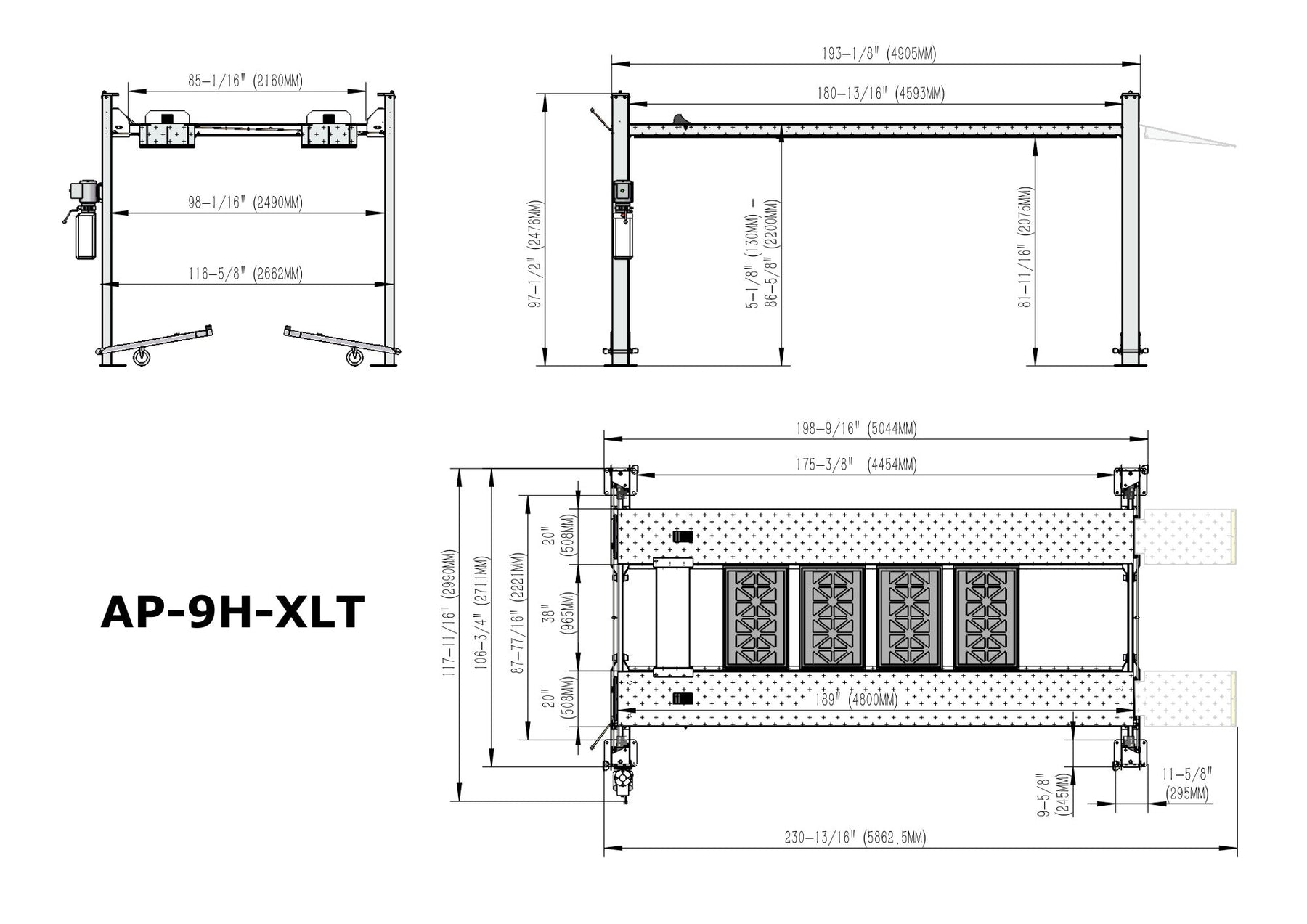 • AP-9H-XLT Model Overall Dimensions: 199"L x 118"W x 98"H
