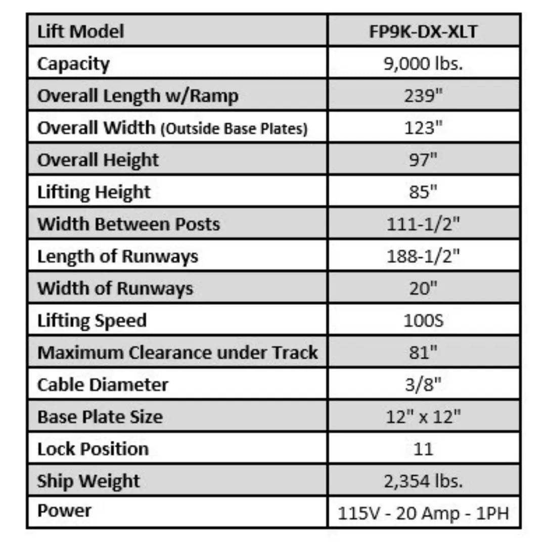 Equipped with a cable-driven system for smooth and reliable lifting, the FP9K-DX-XLT features a single-point manual lock release and adjustable locking positions for ease of use and flexibility. Safety is a top priority, addressed through the slack cable safety system, ensuring stability under all conditions. Steel approach ramps simplify vehicle loading and unloading while providing durability for daily use.